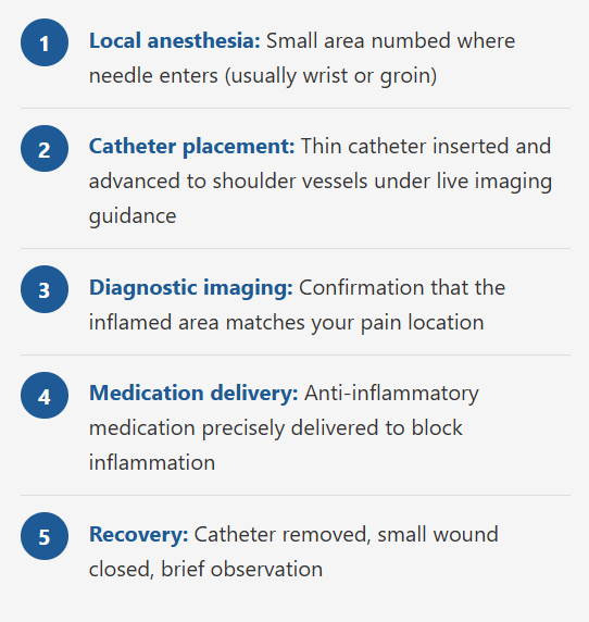 1. Identification: Using advanced imaging (fluoroscopy – similar to real-time X-ray), your interventional radiologist visualizes the blood vessels supplying the inflamed shoulder tissue